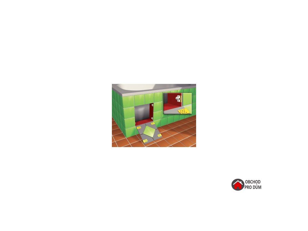 Instalace: 1) Kotvící plech s magnetem přilepíme na kraj obkladačky z rubové strany. 2) Obkladačku přilepíme na určené místo a dorovnáme kotvící plech s magnetem. 3) Pokud revizní otvor končí u podélné stěny, ohneme kotvící plech s magnetem na místě perforace o 90° a přilepíme jej na obklad podélné stěny. 4) Kryt revizního otvoru sestavíme z několika obkladaček. Čtyři kotvící plechy přilepíme pečlivě na rubovou stranu obkladaček. Po zatvrdnutí lepidla můžeme usadit kryt revizního otvoru.