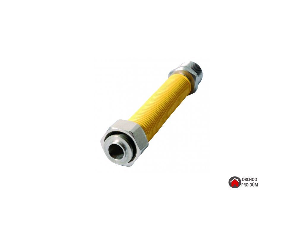Ohebná natahovací hadice pro plyn. Max. pracovní přetlak 0,5 bar a pracovní teplota -20 °C až 120 °C. Korugovaná hadice v 1.4404 (AISI 316L) - žíhaná austenitická nerez ocel podle normy EN 10028, vnější žlutý ochranný potah. Vnější kuželový závit z austenitické nerez oceli dle normy EN 10088 se závitem dle EN 10026 R/ISO 7 R. Otočná převlečná matice z CW617N z poniklované mosazi, vnitřní část z austenitické nerez oceli s výstupkem pro fixaci plochého těsnění, ploché pryžové těsnění pro plyn.