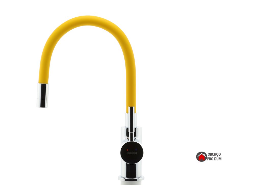 Prvotřídní povrchová úprava a chrom. Stojánková dřezová baterie s žlutým FLEXI ramenem. Součástí baterie jsou přívodní hadičky.